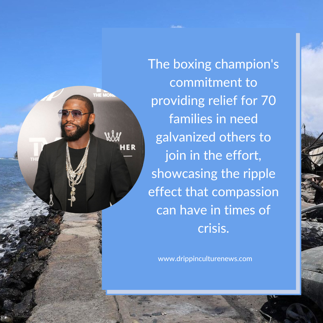 Floyd Mayweather's decision to fund the evacuation of 70 families from the wildfires in Maui is a testament to his unwavering dedication to making a positive impact. Beyond his boxing accolades, he stands as a beacon of hope, reminding us all that acts of compassion can transcend boundaries and inspire others to come together in times of crisis. Mayweather's philanthropy serves as a reminder that champions are not solely defined by their victories in the ring, but also by the difference they make in the lives of others..